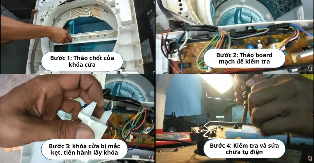 - Kiểm tra tụ điện: Trong một số trường hợp, tụ điện của máy giặt bị hỏng cũng có thể gây ra lỗi khóa cửa. Nếu bạn có kiến thức về điện tử, bạn có thể kiểm tra và thay thế tụ điện. Tuy nhiên, tốt nhất là nên nhờ đến thợ sửa chữa máy giặt chuyên nghiệp.