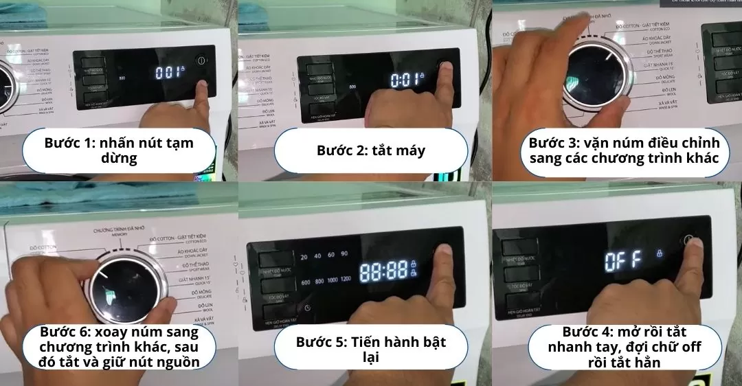 - Thao tác tắt/mở nhanh: Thực hiện thao tác mở rồi tắt máy nhanh chóng, đợi màn hình hiển thị chữ “off” thì tắt hẳn. Sau đó bật lại và xoay núm sang chương trình khác.