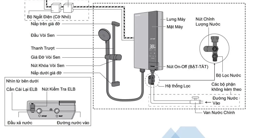 - Thân máy: Là bộ phận quan trọng nhất của máy nước nóng Panasonic. Bao gồm vỏ khung bình, các đèn báo, các nút điều chỉnh (nút chỉnh công suất, nút bật / tắt máy, nút kiểm tra ELB), cổng đường nước ra, bộ lọc nước vào (van khóa nước, van điều chỉnh lưu lượng nước).