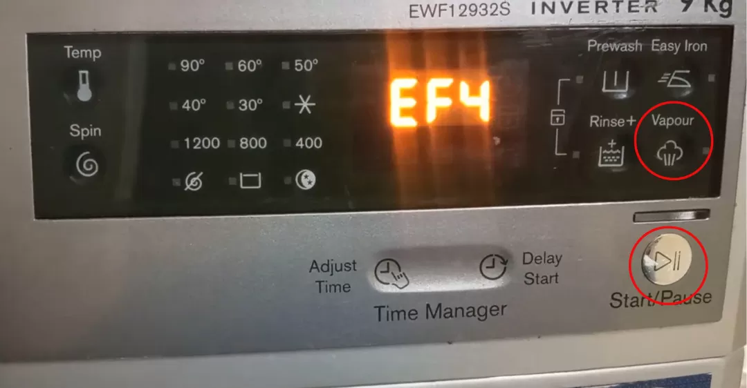- Bước 4: Sau khi xác định được lỗi EF4, bạn có thể tiếp tục nhấn nút “Hơi nước / Vapour” để kiểm tra xem có các mã lỗi khác đang ẩn giấu hay không. Điều này sẽ giúp bạn có cái nhìn tổng quan hơn về tình trạng của máy giặt.