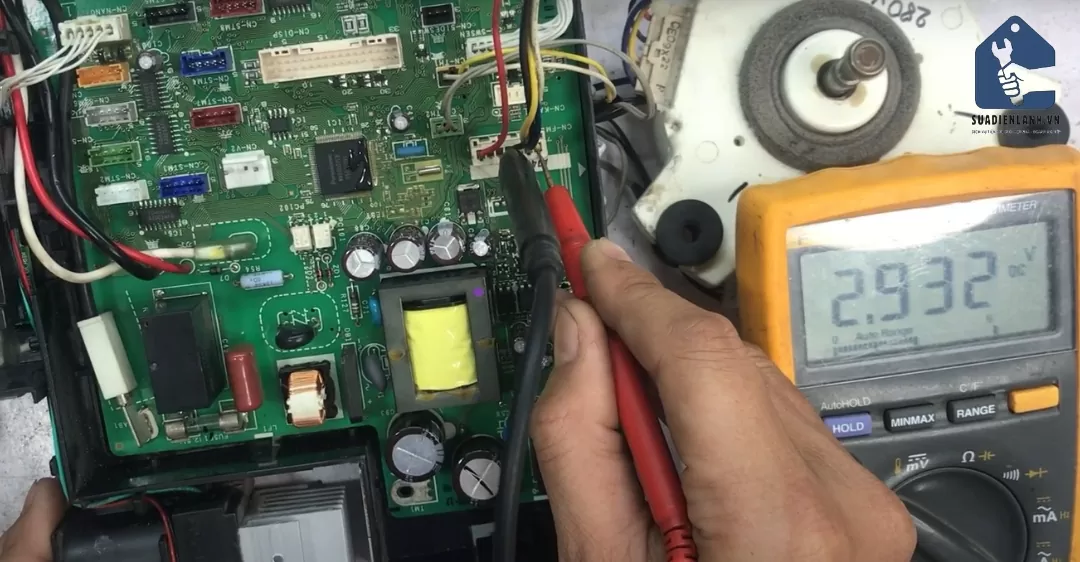 - Bước 2: Kiểm tra phần điện trên bo mạch. Cấp nguồn và bật cho máy chạy, chuyển đồng hồ về thang đo 250 VAC, đo tại chân 5-1 tương ứng dây vàng-xanh đảm bảo có nguồn 220 VAC, tiếp tục chuyển sang thang đo 10 VDC đo chân 1-3 tương ứng dây trắng-nâu đảm bảo có nguồn 5 VDC (nếu một trong hai lần đo không có chỉ số tức bo dàn lạnh bị hư).