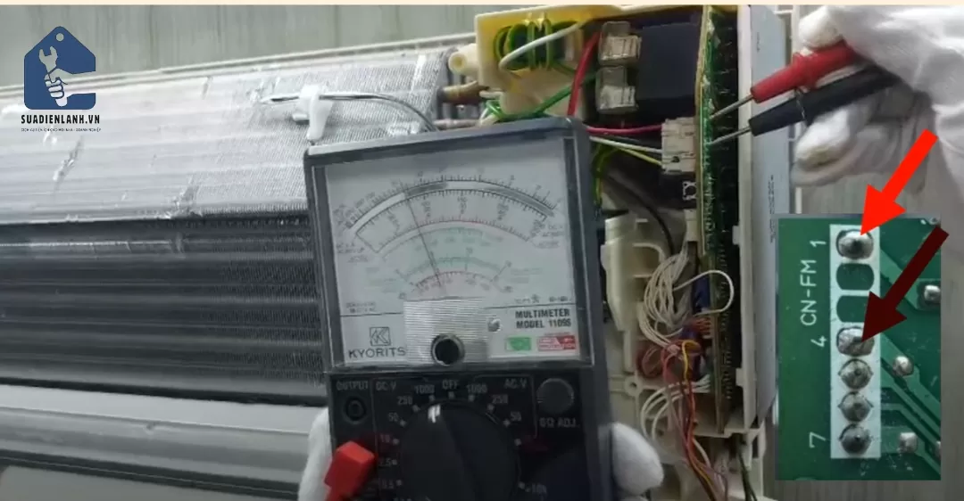 - Bước 4: Kiểm tra nguồn xung phản hồi khi mô tơ quạt quay. Khi đo kim đồng hồ không dao động có nghĩa hỏng mô tơ quạt và cần được thay thế.
