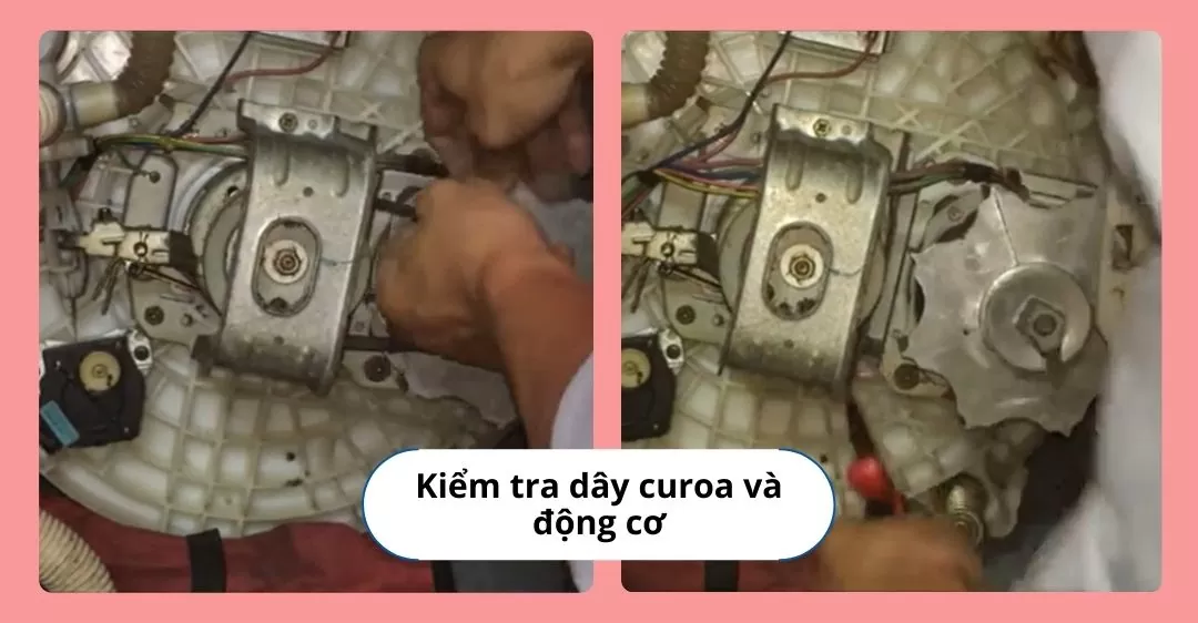 - Kiểm tra dây curoa: Tắt máy giặt, rút phích cắm. Mở nắp lưng máy giặt (thường được cố định bằng ốc vít). Kiểm tra tình trạng dây curoa: có bị đứt, lỏng, mòn hay trượt khỏi puli không?